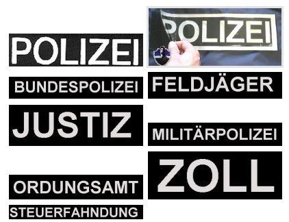 Aufschrift: POLIZEI, BUNDESPOLIZEI, BUNDESWEHR, FELDJÄGER, FEUERWEHR, JUSTIZ, Militärpolizei, ORDNUNGSAMT, SECURITY, THW, VERKEHRSDIENST, ZOLL