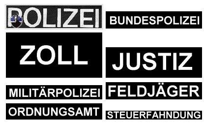 POLIZEI, BUNDESPOLIZEI, BUNDESWEHR, FELDJÄGER, FEUERWEHR, JUSTIZ, Militärpolizei, ORDNUNGSAMT, SECURITY, THW, VERKEHRSDIENST, ZOLL
