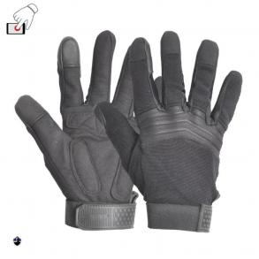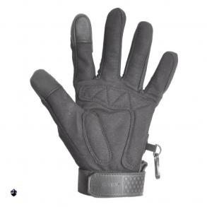 Farbe: schwarz Material: 50% Synthetikleder, 50% Kunstfaser Touchscreen-Funktion in der Spitze des Daumens und Zeigefinger. Die meisten Elektrogeräte mit berührungsempfindlichem Display können mit Daumen und Zeigefinger bedient werden ohne den Handschuh ausziehen zu müssen. Innenfutter mit SILVERPLUS® Imprägnierung verhindert die Vermehrung von geruchsverursachenden Bakterien. Die Handinnenseite besteht aus weichem, wildlederartigem Clarino®- Synthetikleder, das sehr strapazierfähig ist wie die Ergebnisse der Zertifizierung beweisen. Das Leder ist dünn genug um viel Gefühl bei Durchsuchungen und beim Schießen oder sonstigen Tätigkeiten zu vermitteln. Verstärkungen an der Handinnenseite erhöhen die Belastbarkeit des Handschuhs. Durch das wildlederartige Material wird insbesondere das Handling bei Techniken mit dem Tonfa vereinfacht.