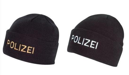 Warme und flexible Strickmütze in Einheitsgröße. Mütze mit behördenrelevantem Stick. Der Stick ist einfarbig mit einer Schrifthöhe von 22 mm.