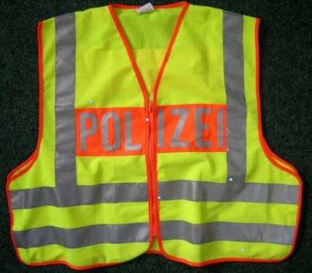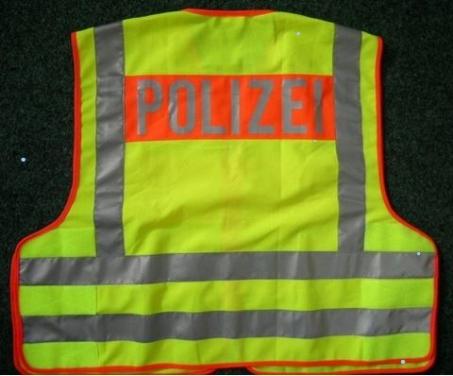 - mit Paspel (Balken) in fluoreszierendem orange und silber-reflektierender Aufschrift "POLIZEI" im Brust- und Rückenbereich