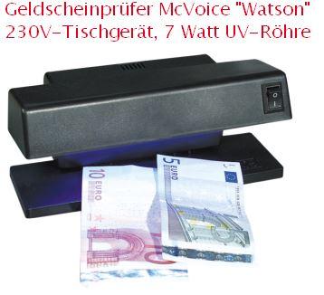 Geldscheinprüfer McVoice "Watson" 230V-Tischgerät, 7 Watt UV-Röhre Art.-Nr. 650-060 - Ein Muss für Handel und Gewerbe. Die 230V-Tischgeräte verfügen über Leuchtstarke Schwarzlicht UV-Röhren, die selbst bei Tageslicht die UV-aktiven Farbpartikel in Euro-Banknoten sichtbar machen. Lieferumfang: Geldscheinprüfer, Anleitung Garantieangaben: 2 Jahre gesetzliche Gewährleistung Abmessungen Paket (B x H x T): 120 x 185 x 130 mm
