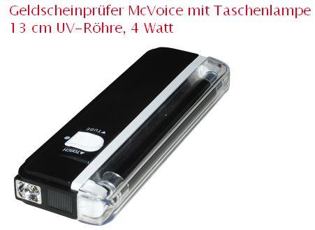 Geldscheinprüfer McVoice mit Taschenlampe 13 cm UV-Röhre, 4 Watt Damit gehen Sie auf Nummer sicher. Bei Zweifel an der Echtheit von Geldscheinen, ist das handliche Testgerät schnell zur Stelle. Einfache Überprüfung mit integrierter Taschen- und Schwarzlichtlampe. Die UV-aktiven Farbpartikel in Geldscheinen werden auf einen Blick sichtbar - selbst bei Tageslicht. Kleines Gerät mit Halteriemen, optimal für jede Handtasche. Überall einsetzbar durch Batteriebetrieb.