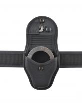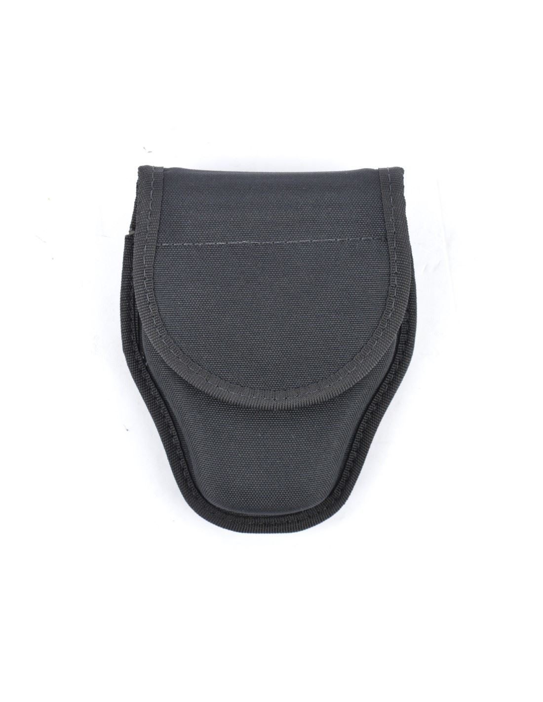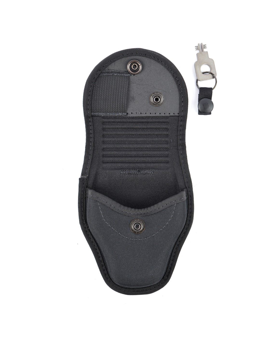Formstabile, hochwertig verarbeitete Handfesseltasche mit Verschlusslasche mit Druckknopfverschluss und innenliegender Befestigungsmöglichkeit für Handfesselschlüssel. Auch passend für den großen Schlüssel der CLEJUSO 9.