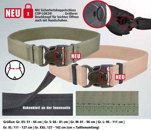 Gürtelbreite: 45 mm Farbe: grün oder beige, Größen: XS - XXL Dienstkoppel High Protection ohne Klett an der Innenseite. Koppelschloss mit Sicherung gegen ungewolltes Öffnen. Farbe grün: Art.-Nr: ...