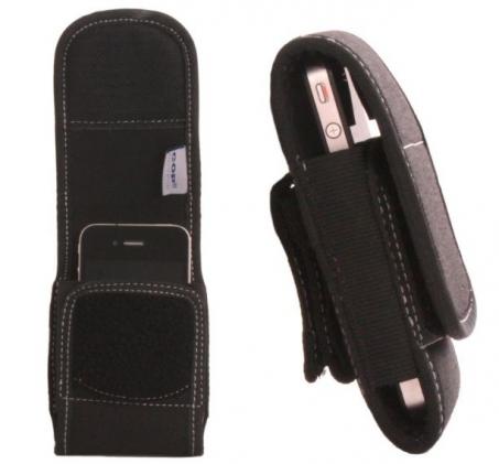 Gepolsterte Tasche für Smartphones aus Cordura mit stabiler Duo-Gürtelschlaufe. Der Gürtel wird durch die interne Schlaufe gezogen und dann mit der zweiten oberen Schlaufe mit Klettverschluss gesichert. Befestigt man das Holster nur mit der oberen Schlaufe kann es befestigt/abgenommen werden ohne den Gürtel zu öffnen.