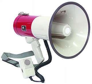 Durch die Leistung von 25 Watt sind mit diesem Megaphon auch grössere Entfernungen überbrückbar. Praktisch in der Handhabung zeigt sich das separate Handmikrofon und Schultergurt.