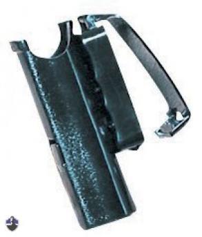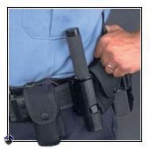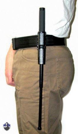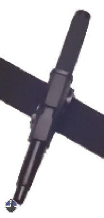In die Halterung integriert ist ein Clip, der den Schlagstock in der Halterung fixiert, damit er nicht unbeabsichtigt herausfällt.