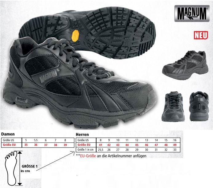 Obermaterial: atmungsaktives Nylon mit Einlagen aus Leder. Das MAGNUM Modell 'MPT', Abkürzung für "MAGNUM Police Trainer", ist ein extrem leichter und sportlicher Halbschuh von Magnum . Das Obermaterial ist aus einem netzartigen, besonders leichten und atmungsaktiven Nylon mit abriebfesten Einlagen aus Leder an den Stellen welche am meisten belastet werden. Das besondere Innenfutter ist mit anti-mikrobiellen Agion behandelt und sorgt für ein angenehmes Klima innerhalb des Schuh und leitet Wärme und Feuchtigkeit vom Fuß an die Außenseite ab. Die patentierte Agion Technologie auf Silberbasis bietet einen hygienischen und nachhaltigen Schutz gegen das Wachstum von Mikroben ohne Chlorierung. Rutschfeste, abriebarme und ölresistente Vibram Sohle und eine Stoßdämpfende Zwischensohle aus EVA ergeben nicht nur weniger Geräusche beim Abrollen sondern gewährleisten einen sicheren Halt auf allen Oberflächen. Die verwendete Leiste wurde für Sportschuhe entwickelt. Im MAGNUM 'MPT' sind keinerlei Metallteile verbaut, der Schuh ist daher "Flughafen freundlich" denn Metalldetektoren springen nicht an, daher auch geeignet für Flughafen- und Sicherheitspersonal.